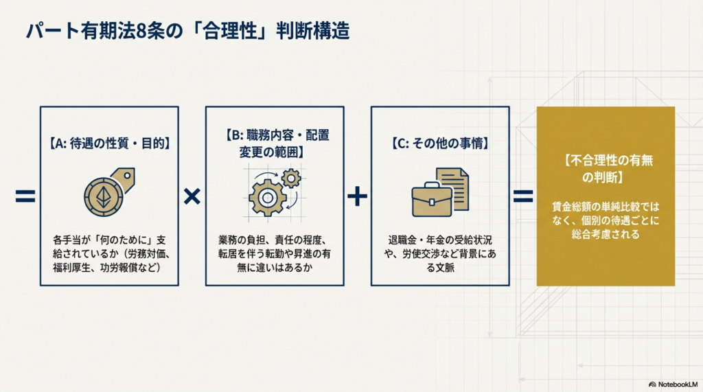 原則として待遇の比較は賃金項目ごとに行われます。そして、期末手当Bは老齢厚生年金の受給開始年齢の引き上げに伴う減収を補填する目的で導入されたものであることから、基本給を補完するものであり、基本給と期末手当Bは合計して判断すべきとしました。