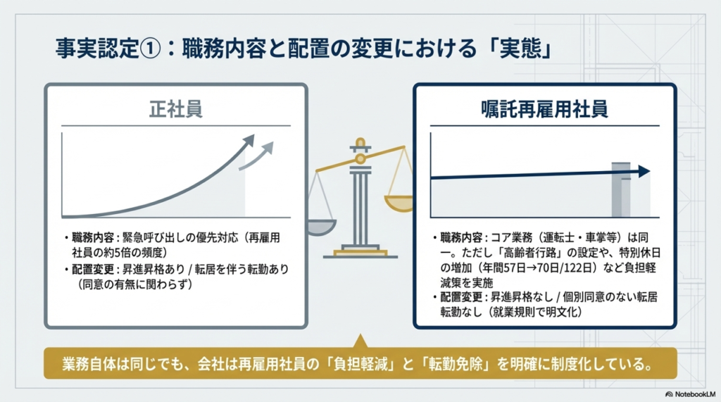 以上の通り、「日々の仕事内容はほぼ同じだが、転勤の有無やキャリア形成(昇進)の面で大きな差がある」というのが、争点1に対する裁判所の主要な判断です。