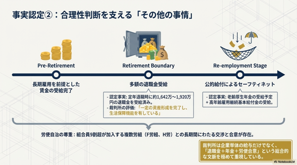 再雇用社員は多額の退職金を受領済みであり、さらに老齢厚生年金や高年齢雇用継続基本給付金による生活保障の補完が予定されている,。
