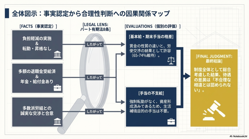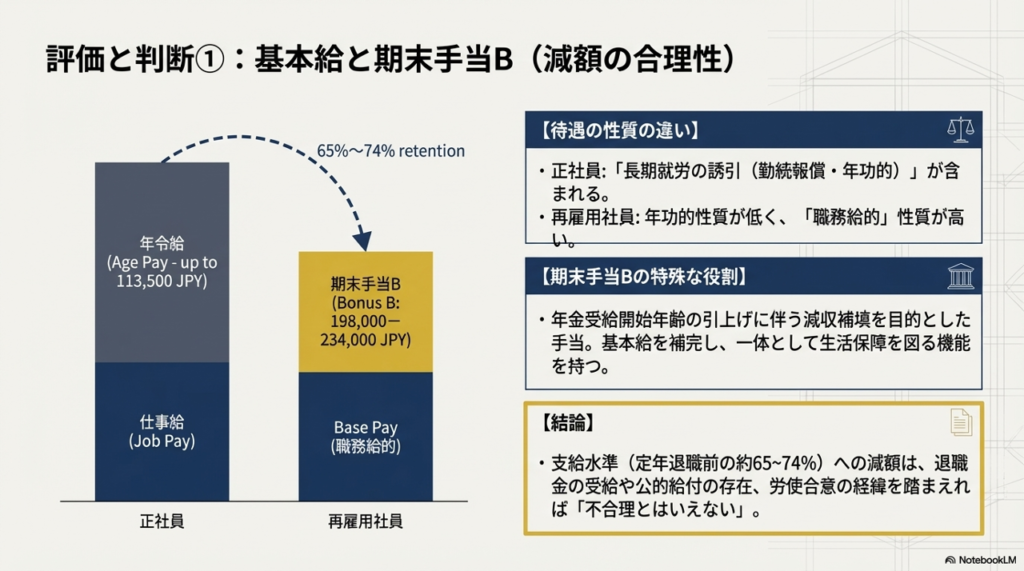 以下の事情を総合的に考慮し、基本給(これを補完する期末手当B含む)の格差は不合理ではないと結論付けました。