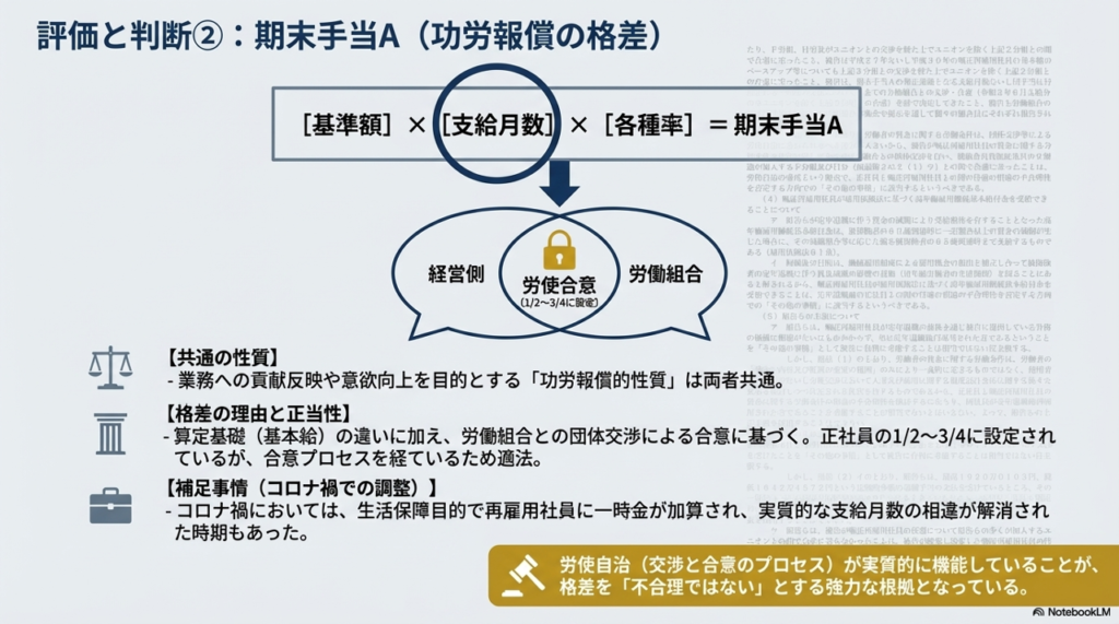 期末手当Aの支給月数(およびコロナ禍での一時金加算)は、被告と各労働組合との団体交渉を経て決定されたものです。特に、組合員資格のある従業員の9割超が加入する2つの組合(F労組、H労)との間で合意に至っている事実は、「労使自治」の尊重という観点から、格差の不合理性を否定する重要な事情とされました。