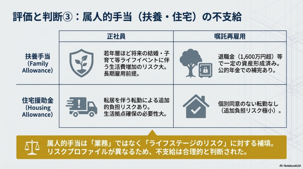 裁判所は、扶養手当の性質を「従業員の福利厚生を目的として、職務内容とは無関係に、ライフイベントに応じた生活費の一部を援助するもの」と定義しました。不合理ではないとされた主な理由は以下の通りです。